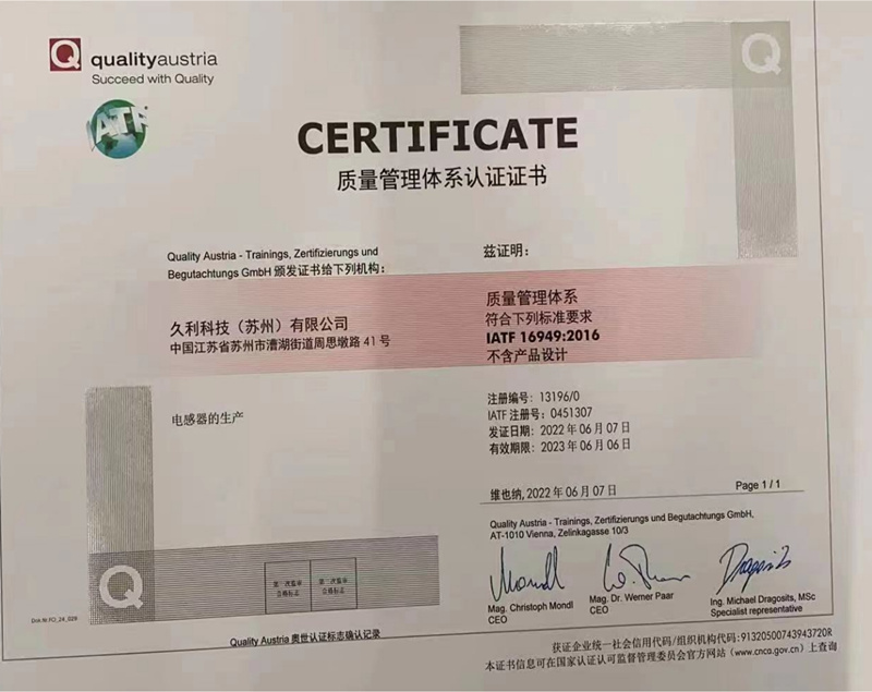 热烈祝贺久利科技(苏州)有限公司顺利通过IATF 16949:2016质量管理体系认证获得了进入汽车领域的绿色通行证 我们将以更严格的质量管理 为客户提供可...